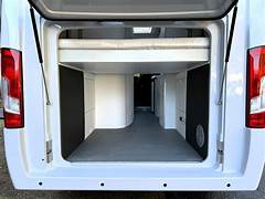 Rather than the two swing doors typically used in vans, we chose a natural fibreglass wing door for access to the large rear locker.