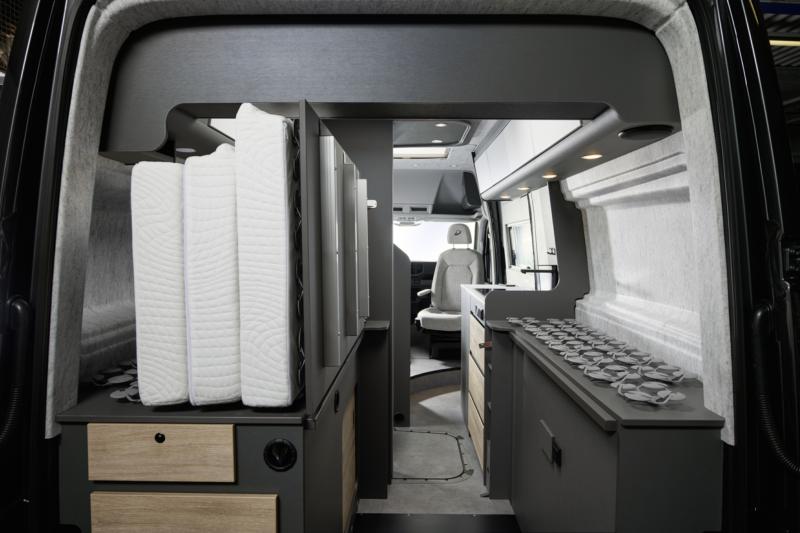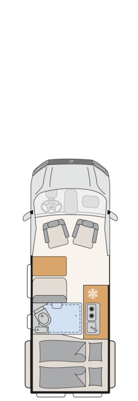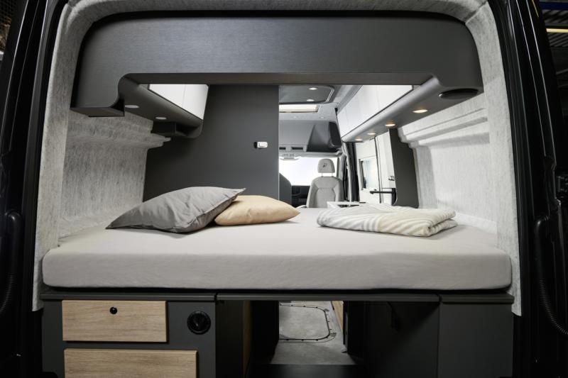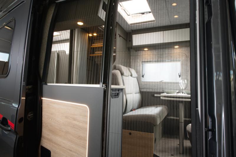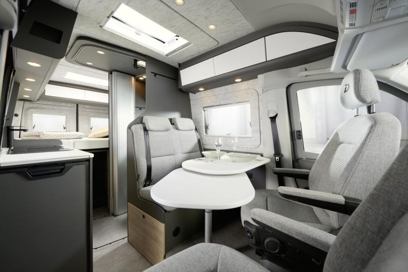 Cosy and spacious: half-dinette seating lounge with 50 cm- wide swivel table. The bench seat includes a backrest with tilt adjustment for maximum travelling comfort. The fabric wall panelling is sound-absorbent and breathable, creating a pleasant atmosphere inside the vehicle.